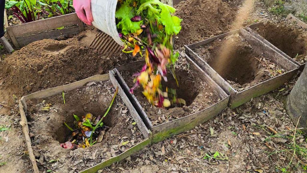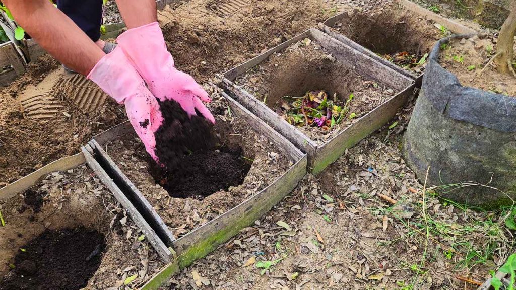 After adding all the organic materials, the next step is to cover the hole with the soil that was dug out earlier. This soil layer acts as a protective cover, ensuring that the decomposition process continues smoothly while maintaining soil moisture levels.