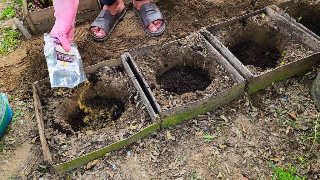 Watering is the final and most important step in this method. A generous amount of water is given to the newly planted seedlings to help the soil settle around the roots. This also activates the decomposition process within the soil, allowing the buried kitchen waste to break down and release nutrients efficiently.