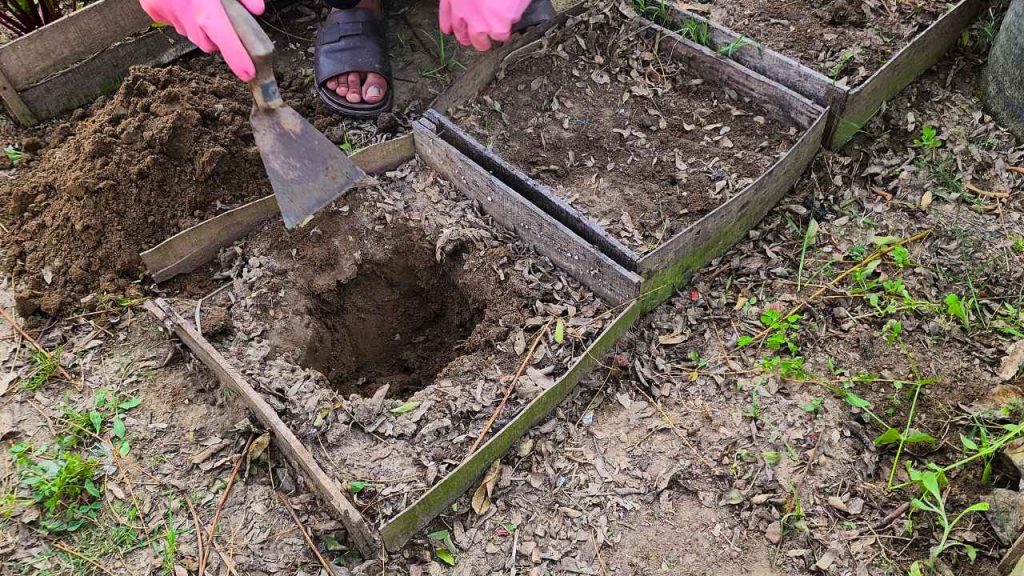 To start, dig a deep hole in the planting area. The size of the hole should be large enough to hold enough organic material that will decompose over time and continuously feed the plants.